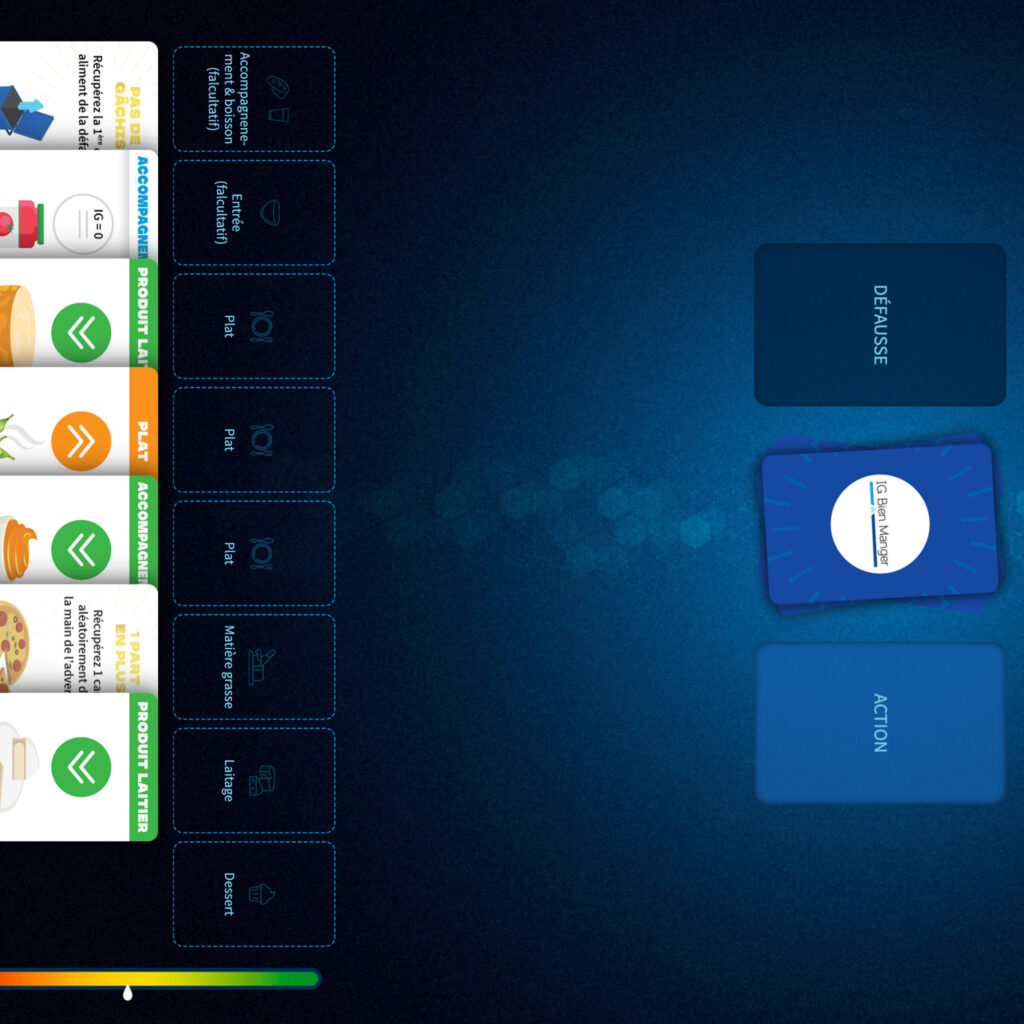Ce jeu, en version 2 ou 4 joueurs en fonction de la taille de votre écran, permet l’apprentissage de la conception d’un repas équilibré à faible indice glycémique (IG), de manière ludique. Les joueurs devront poser leurs cartes habilement afin de créer un plateau repas équilibré en respectant les consignes suivantes :